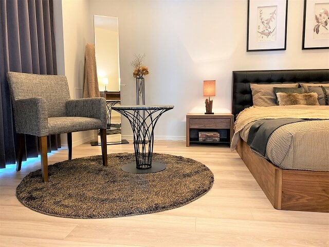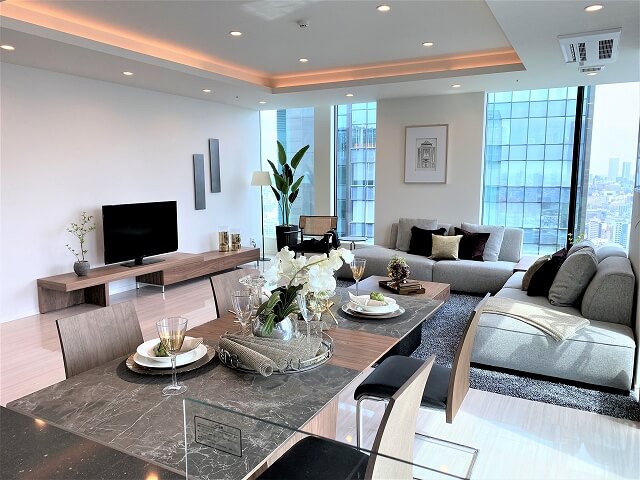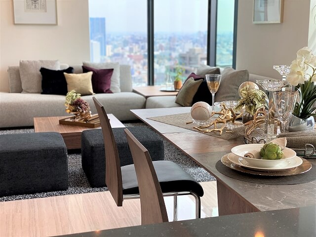 29階建てのタワーマンションの最上階にモデルルームのトータルコーディネートの依頼を受けて対応した事例です。日当たりが良く開放感のある空間でしたので背の低い家具でウォールナットとライトグレーのソファ(B105-SilverGrey)をメインにしました。お部屋の角から東京タワーを望むことが出来るためソファのコーナー部分はテーブルにして抜け感を重視しました。雑貨を使った演出はアメリカの家具ブランド『Ashley』の物を使っています。ボリュームがあり豪華さを演出できます。シンプルな家具と華やかな雑貨でインテリアのバランスを調整しています。ベッドルームと書斎もありとても快適な空間が仕上がったと思います。