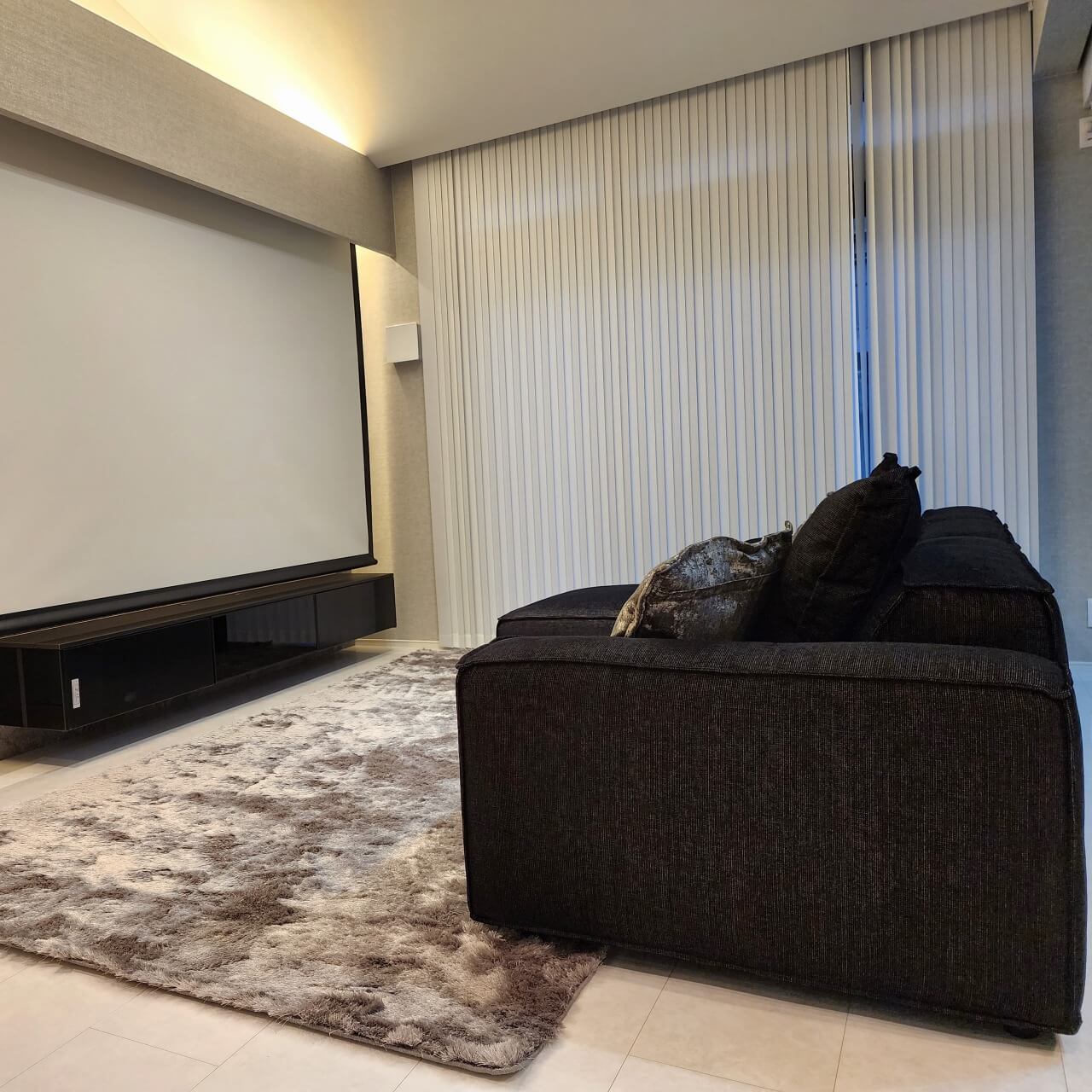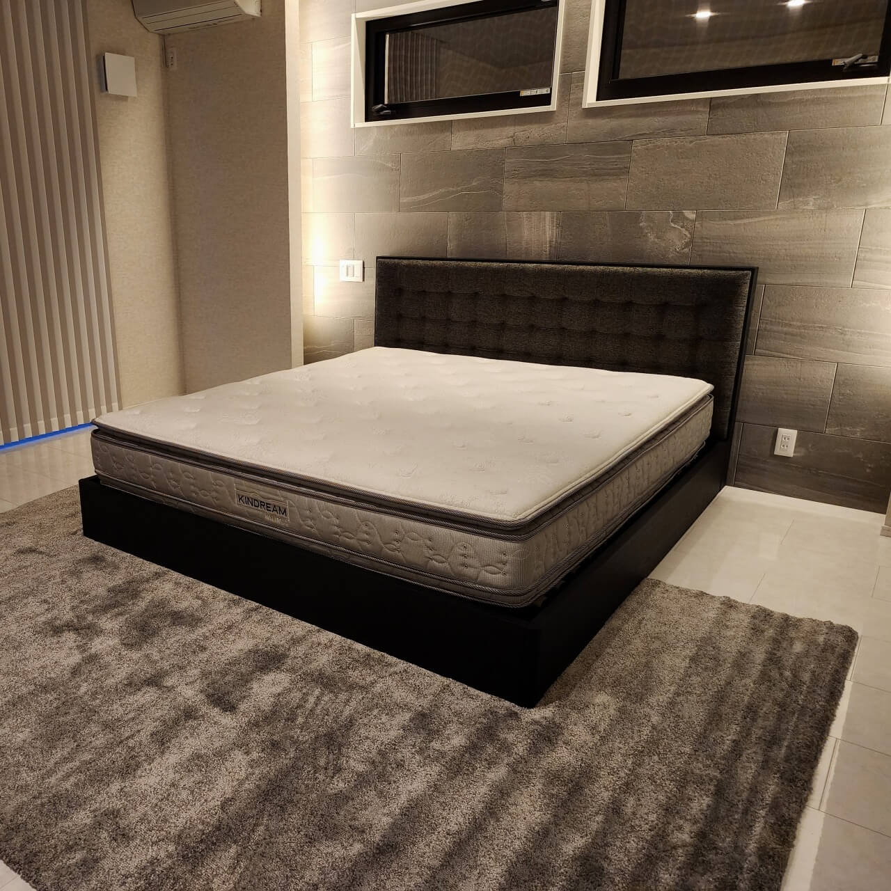 圧迫感の出やすいブラックを多用してのコーディネートですがホワイトのタイルとライトグレーのラグを合わせることによって見事に調和しています。
