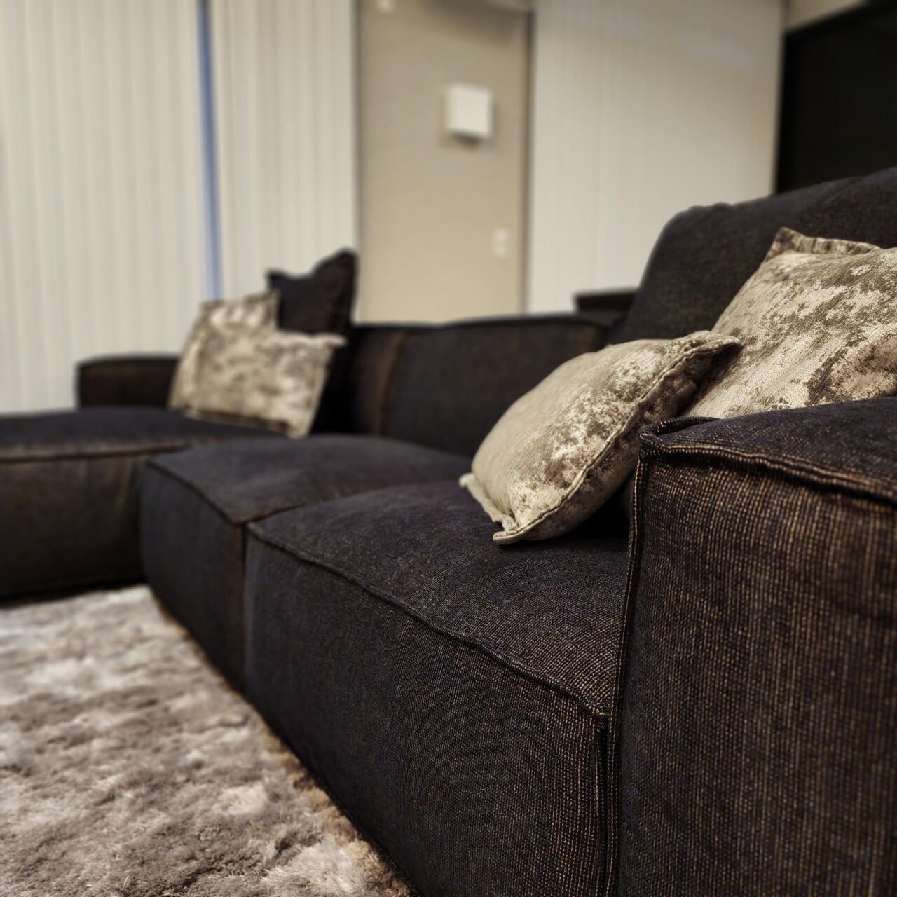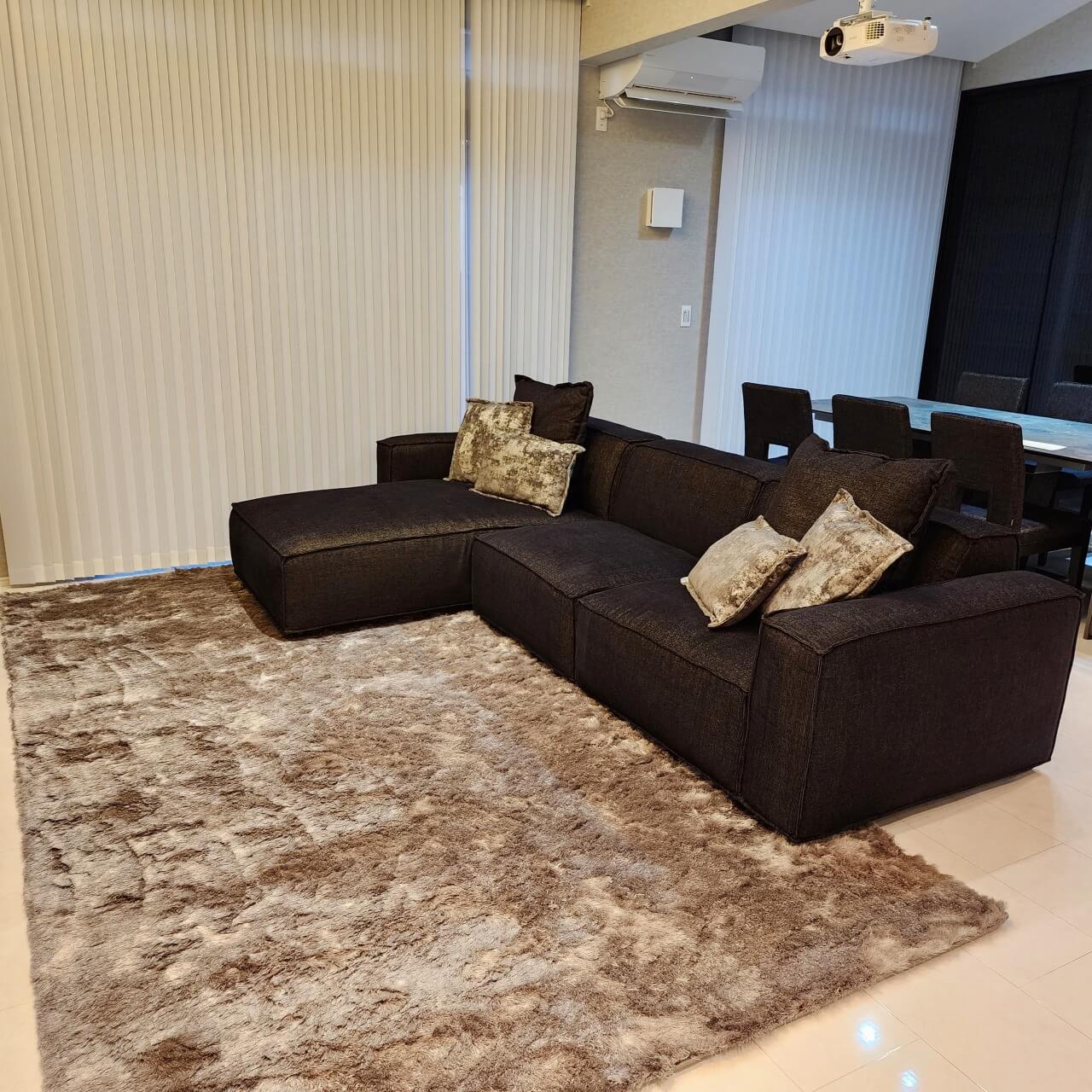 ソファとダイニングチェアを同じ張地FS305(Black×Gold)で揃えたことで統一感のあるお部屋に仕上がりました。