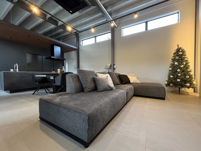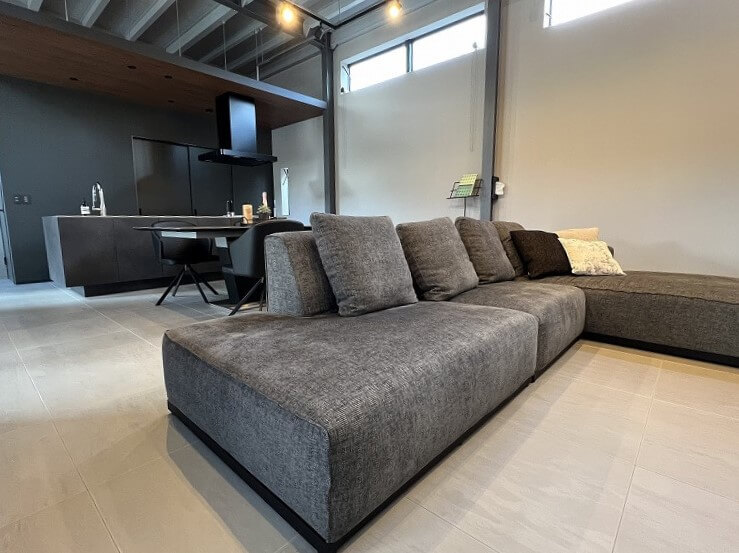 鉄骨むき出しの無骨な印象の空間と、お選びいただいた家具の相性