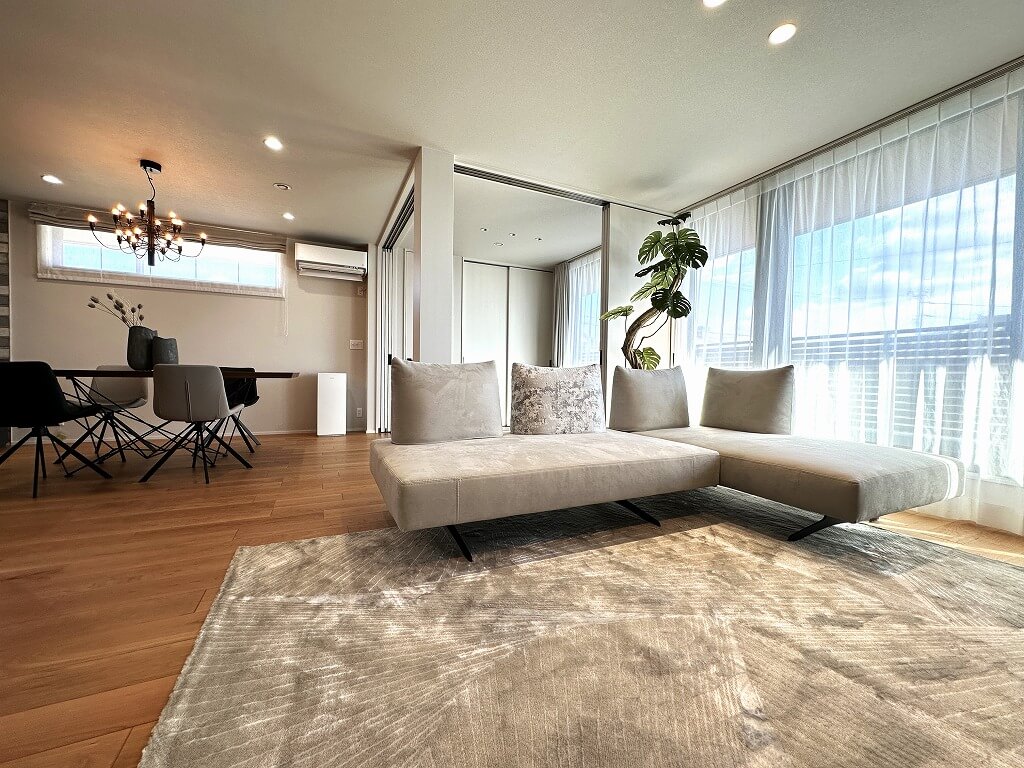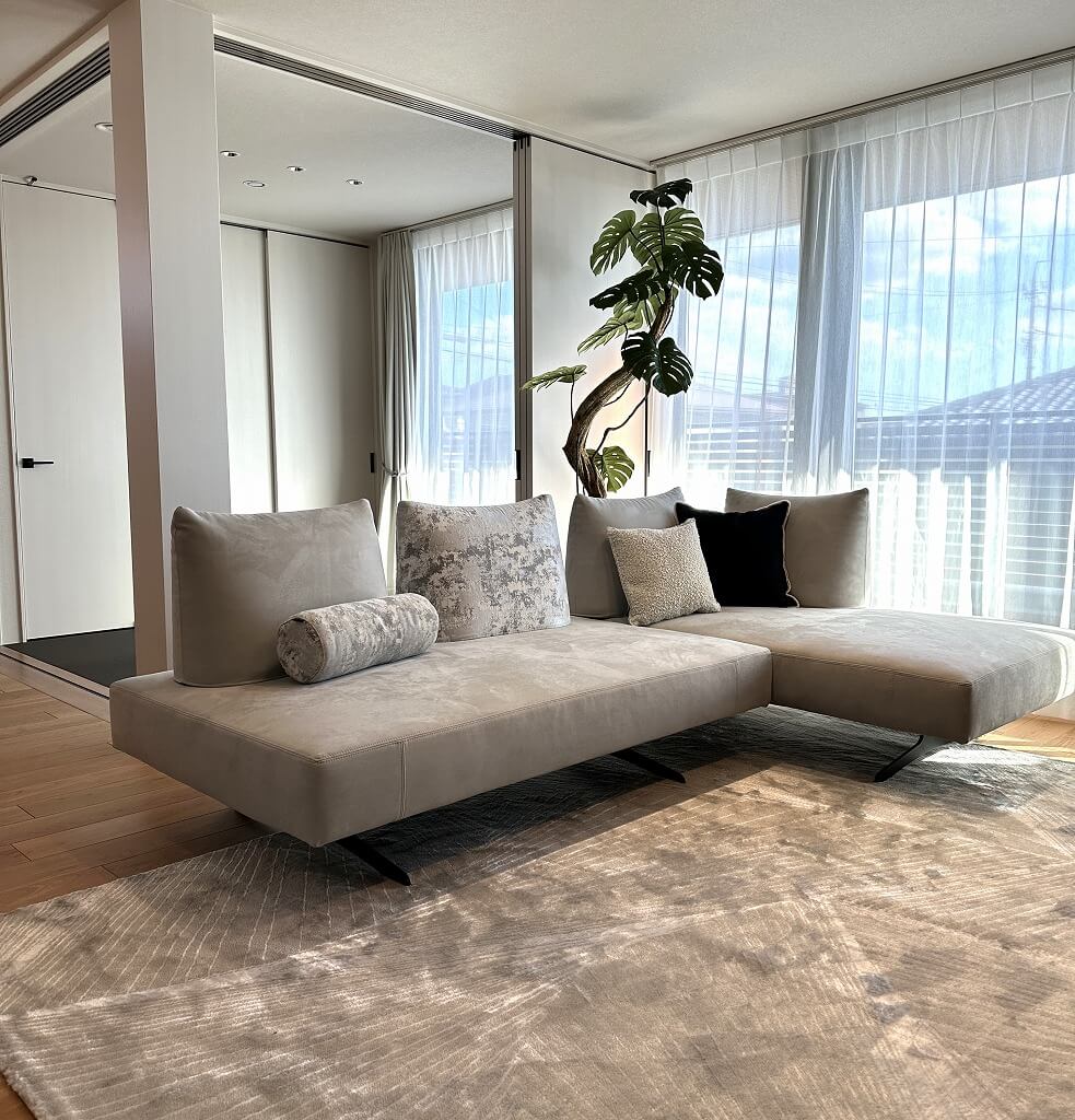 アンジェロはW160を2台組み合わせています。浮遊感のあるアンジェロは背も抜け感があってお部屋をすっきりと魅せてくれますね。 張地B241は撥水加工タイプなのでお子様がいらっしゃっても安心してご利用いただけます。奥様のお気に入りの張地FS311が良いアクセントになっていますね。