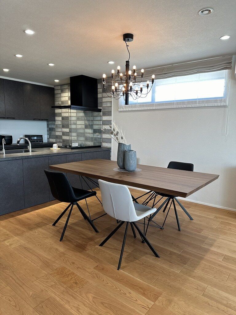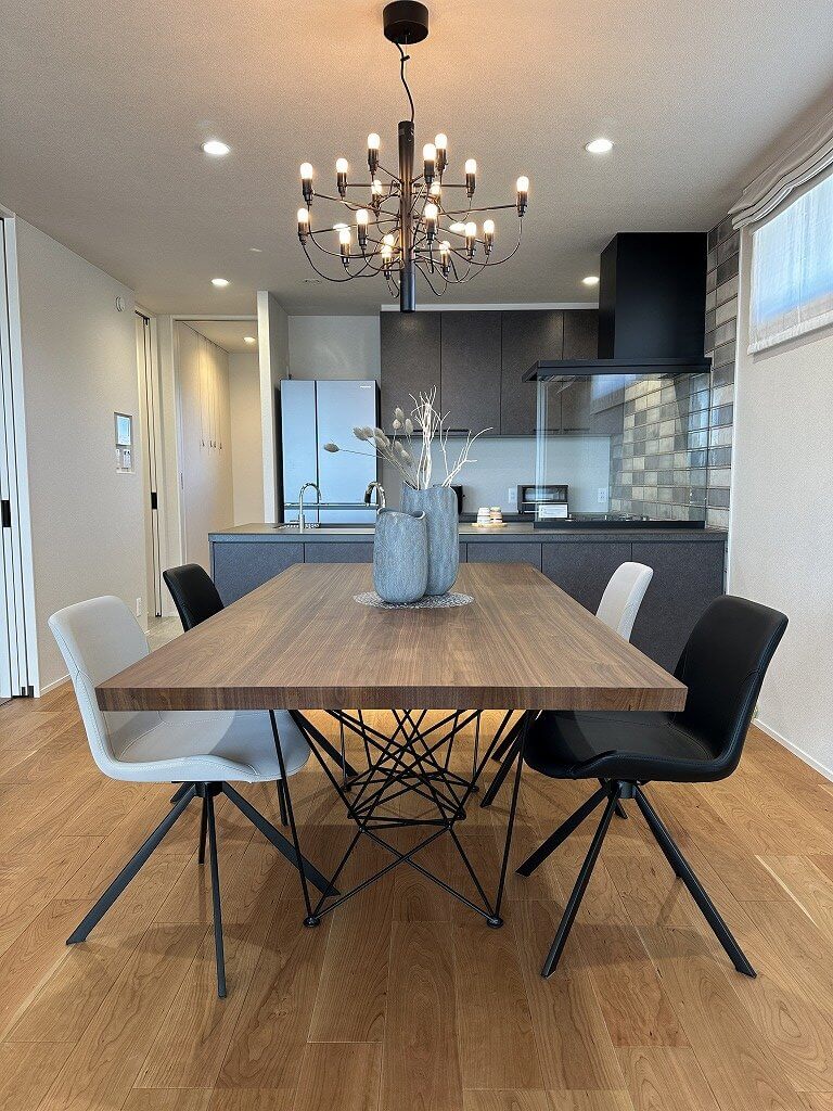 スタイリッシュなキッチンの前にはカルロ(ウォールナット)W200にビオラチェアを2色で合わせ、重くなり過ぎないバランスが後ろに見えるタイルとベストマッチでした。