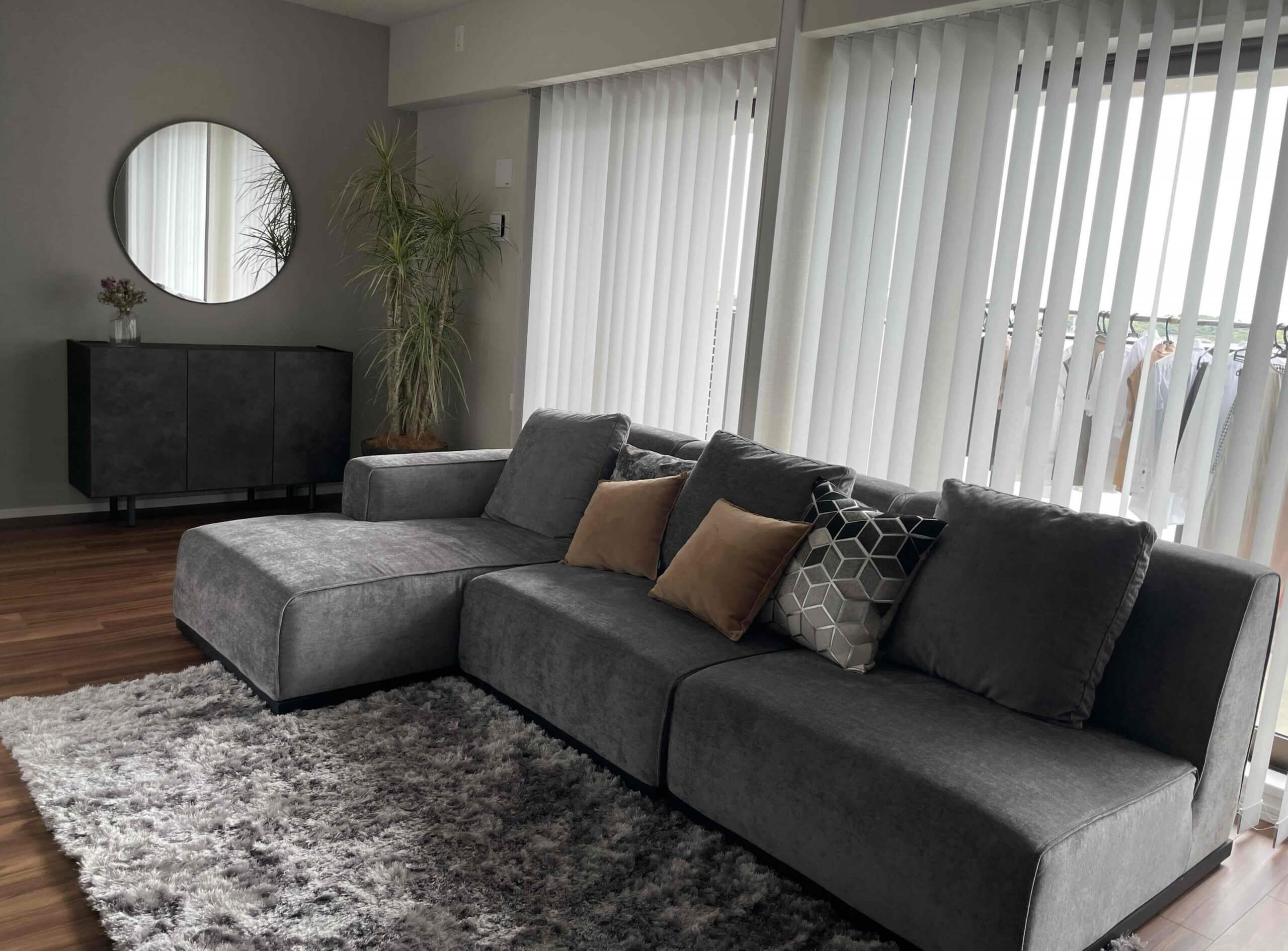 ラグやサイドボード・ダイニングテーブルをグレーにまとめ、