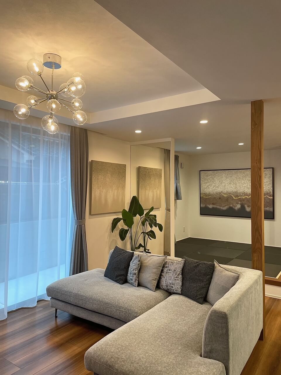 お打合せを重ねながらお部屋づくりのお手伝いをさせていただき、TVボードや照明・アートもご採用いただきました。