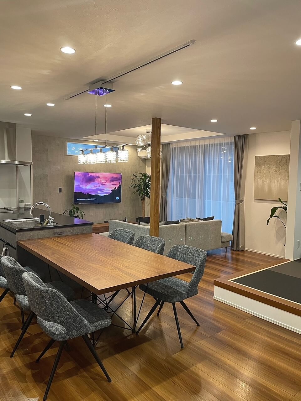 ウォールナットとグレーをベースにしたモダンな空間にシルバー系の照明やアートが映えていてとても素敵なリビングダイニングでした。