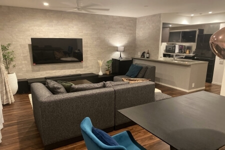 図面上で実感できないほどのお部屋の広さに驚きました。 ダイニングテーブル「OBLO」、カウチソファー「RUSCELLO」 共に大型でサイズ感を感じさせない空間と高級感溢れるお部屋がとても素敵に感じます。 仲間が集まるとき